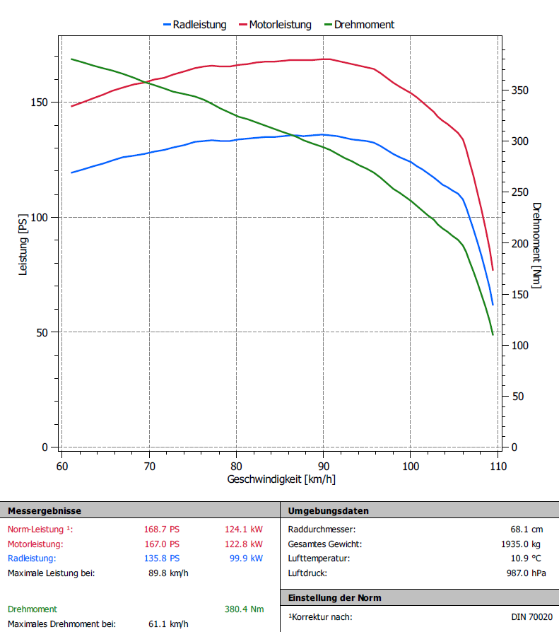 Und ein VW TIGUAN mit einer Serienleistung von 169PS / 380NM. Erreichen wir mit unserer Software Optimierung Stage1 ca. 200PS/ 450 Nm.