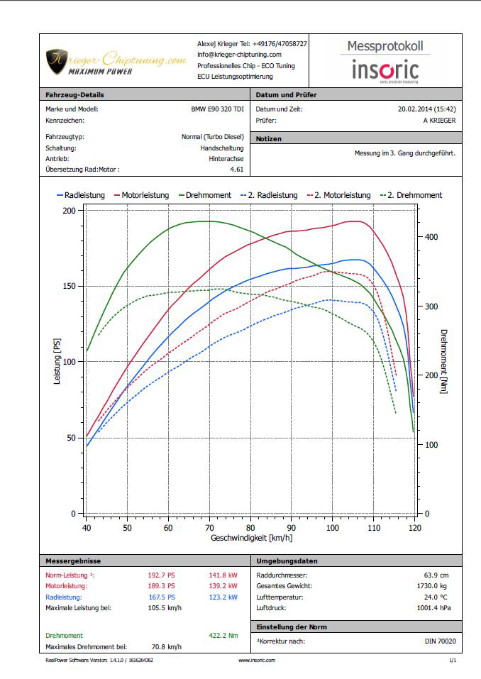 Heute wurde ein BMW E90 320 CDI optimiert. Die Serienleistung beträgt 159PS – 324Nm. Auf Kundenwunsch wurde das Fahrzeug auf 189PS + 422Nm optimiert.