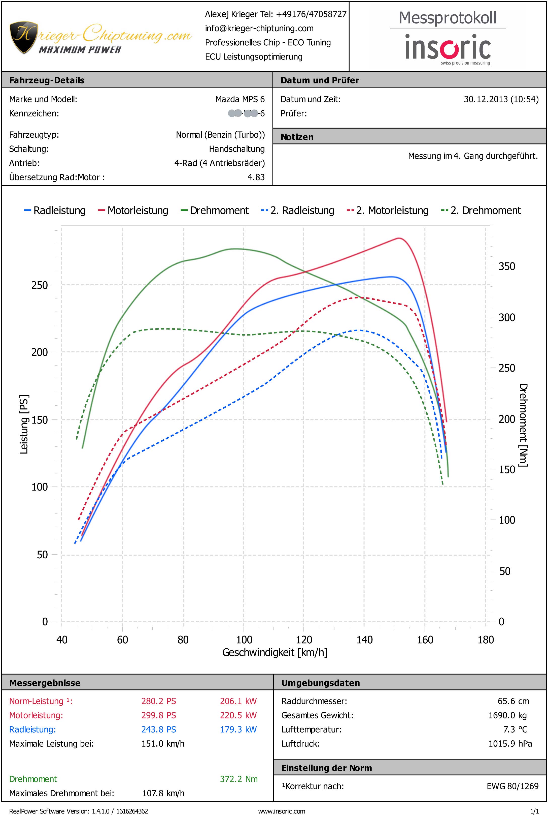 Heute wurde ein Mazda 6 MPS 2,3 Turbo optimiert. Die Serienleistung beträgt 260PS – 350Nm. Auf Kundenwunsch wurde das Fahrzeug auf 300PS + 372Nm optimiert.